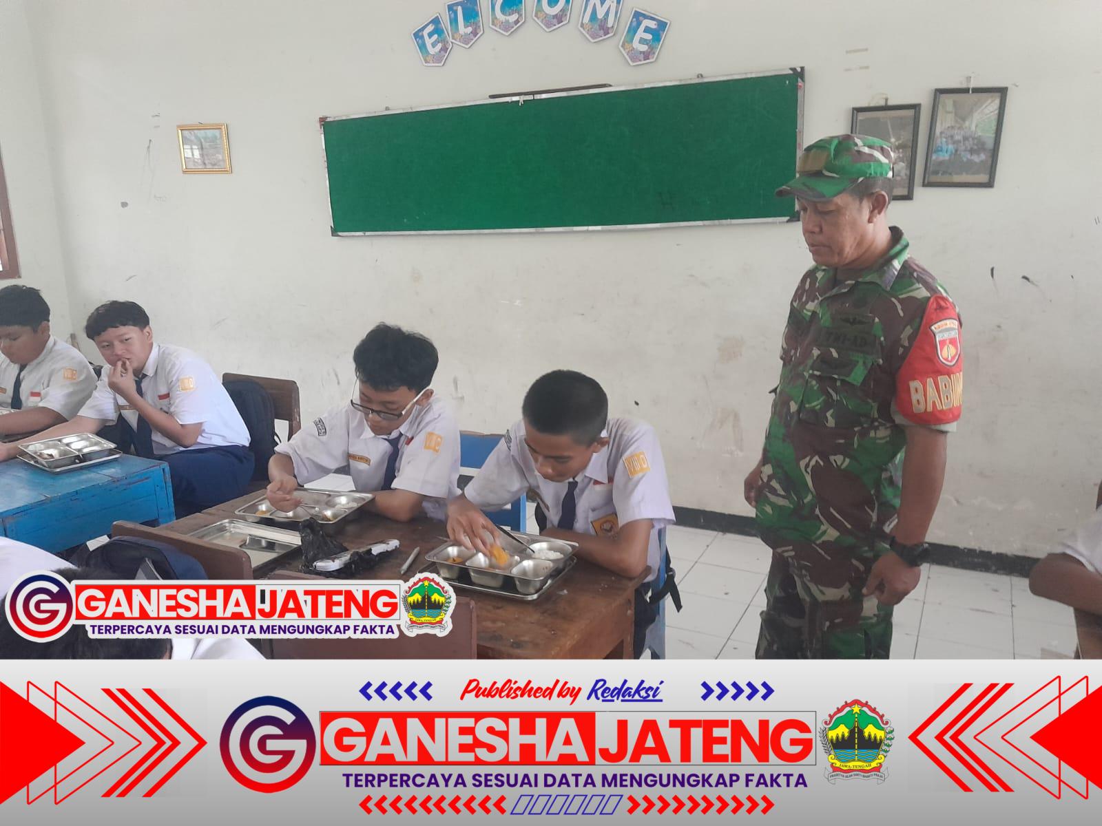 Surakarta, Babinsa Joyotakan Koramil 03/Serengan Kodim 0735/Surakarta Serka Sudiyono melaksanakan Pendampingan pendistribusian Makan Bergizi Gratis (MBG) di SMP Islam Bakti Jl. Wahid Hasim Rt 03 Rw 01 Joyotakan Serengan Kota Surakarta, Kamis Pukul 10.00 Wib (27/11/2025)