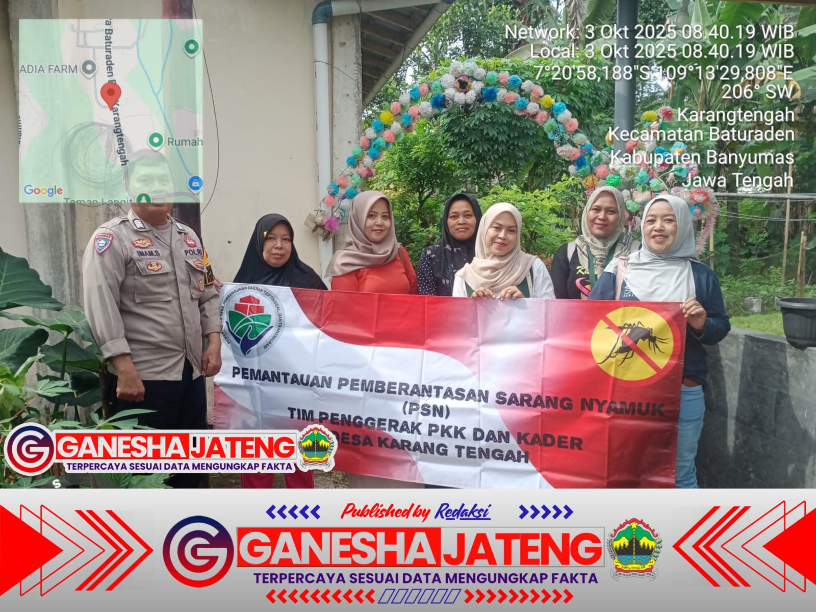 Banyumas Ganeshajateng.com Dalam upaya mencegah penyebaran penyakit demam berdarah dengue (DBD), Polsek Baturraden Polresta Banyumas bersama Perangkat Desa dan tenaga kesehatan menggelar kegiatan Pemberantasan Sarang Nyamuk (PSN) di Desa Karangtengah RT 04 RW 08 pada Jumat (03/10/2025) pagi.