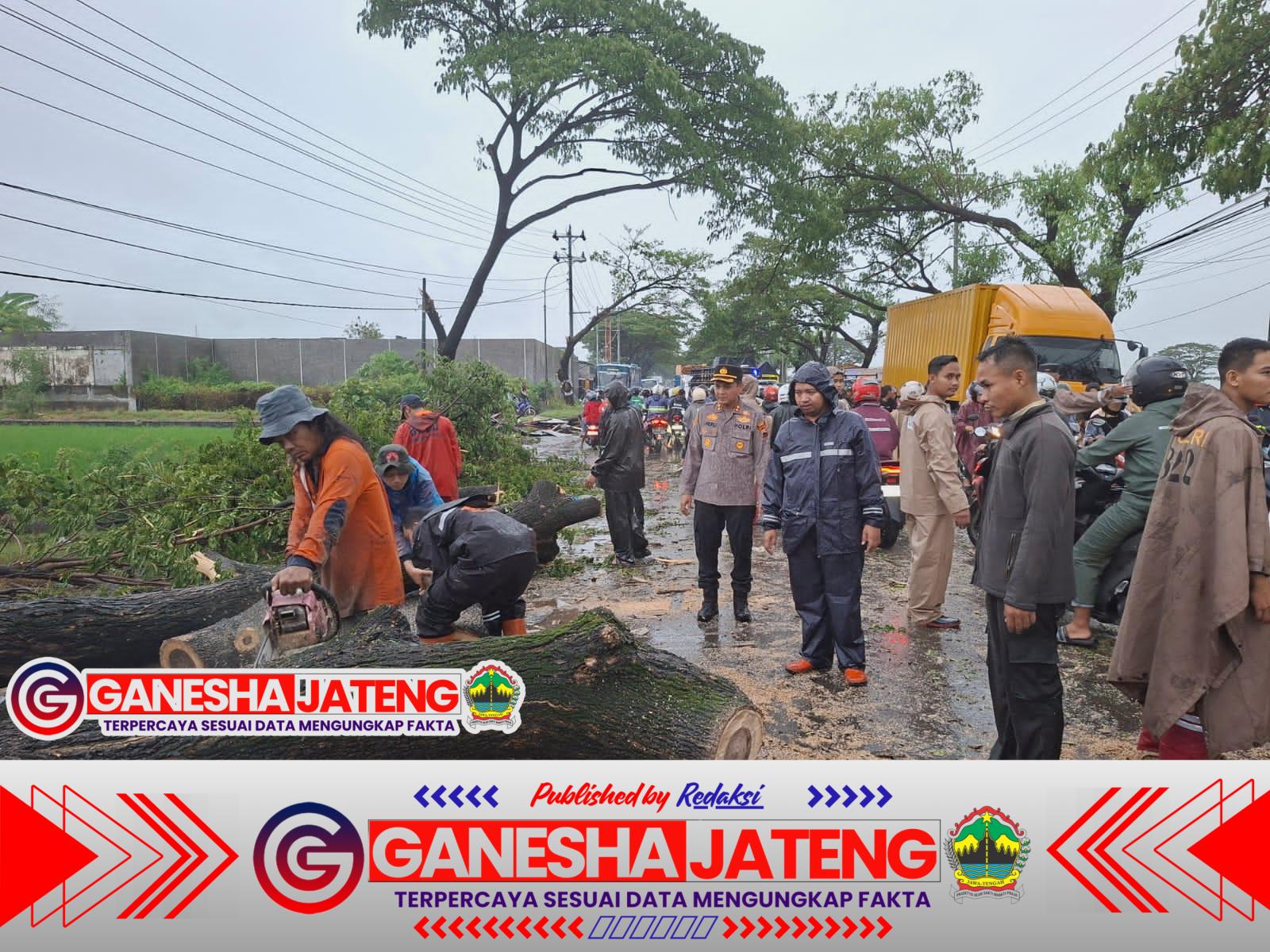 Kudus – Hujan deras disertai angin kencang yang mengguyur wilayah Kabupaten Kudus menyebabkan sebuah pohon tumbang di Jalan Kudus–Pati, tepatnya di Desa Terban, Kecamatan Jekulo, Kudus pada Jumat (24/10) sore.
