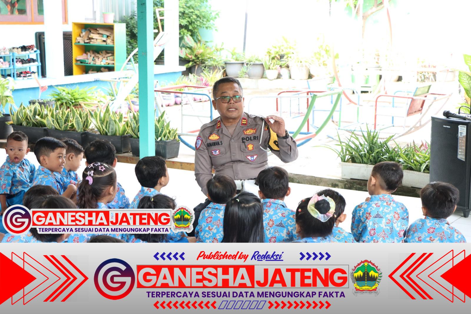 Pati – Satlantas Polresta Pati menggelar program Polisi Sahabat Anak (PSA) di TK Kemala Bhayangkari 43 Pati, Rabu (5/11/2025). Kegiatan ini bertujuan mengenalkan tertib berlalu lintas sejak usia dini melalui pendekatan edukasi yang ramah anak.