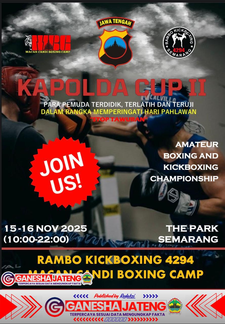 Polda Jateng, Kota Semarang | Dalam rangka memperingati Hari Pahlawan pada 10 November 2025 mendatang, Polda Jawa Tengah kembali menggelar ajang bergengsi Kejuaraan Tinju dan Kickboxing Amatir “Kapolda Cup 2”. Kegiatan ini akan berlangsung di Atrium Utama The Park Semarang, Jl. Madukoro Raya, Semarang Barat pada 15–16 November 2025 mendatang.